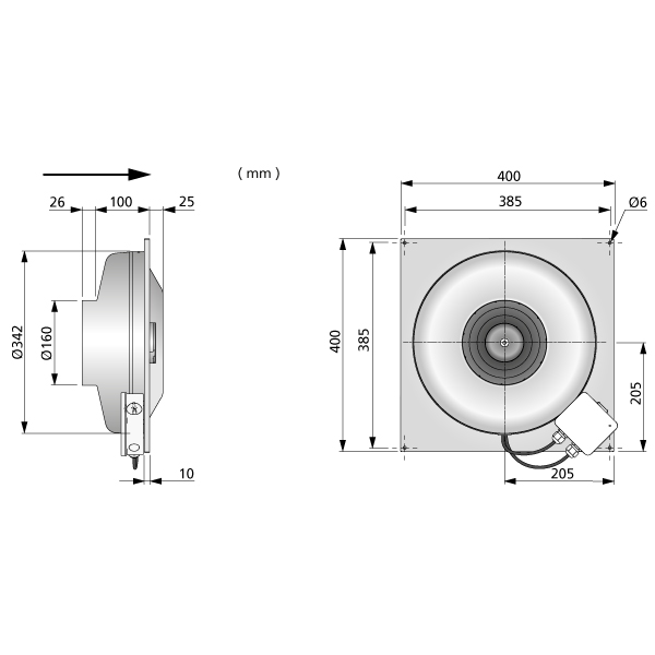- Fläkten är avsedd för installation i kanalsystem, monterad på innervägg.